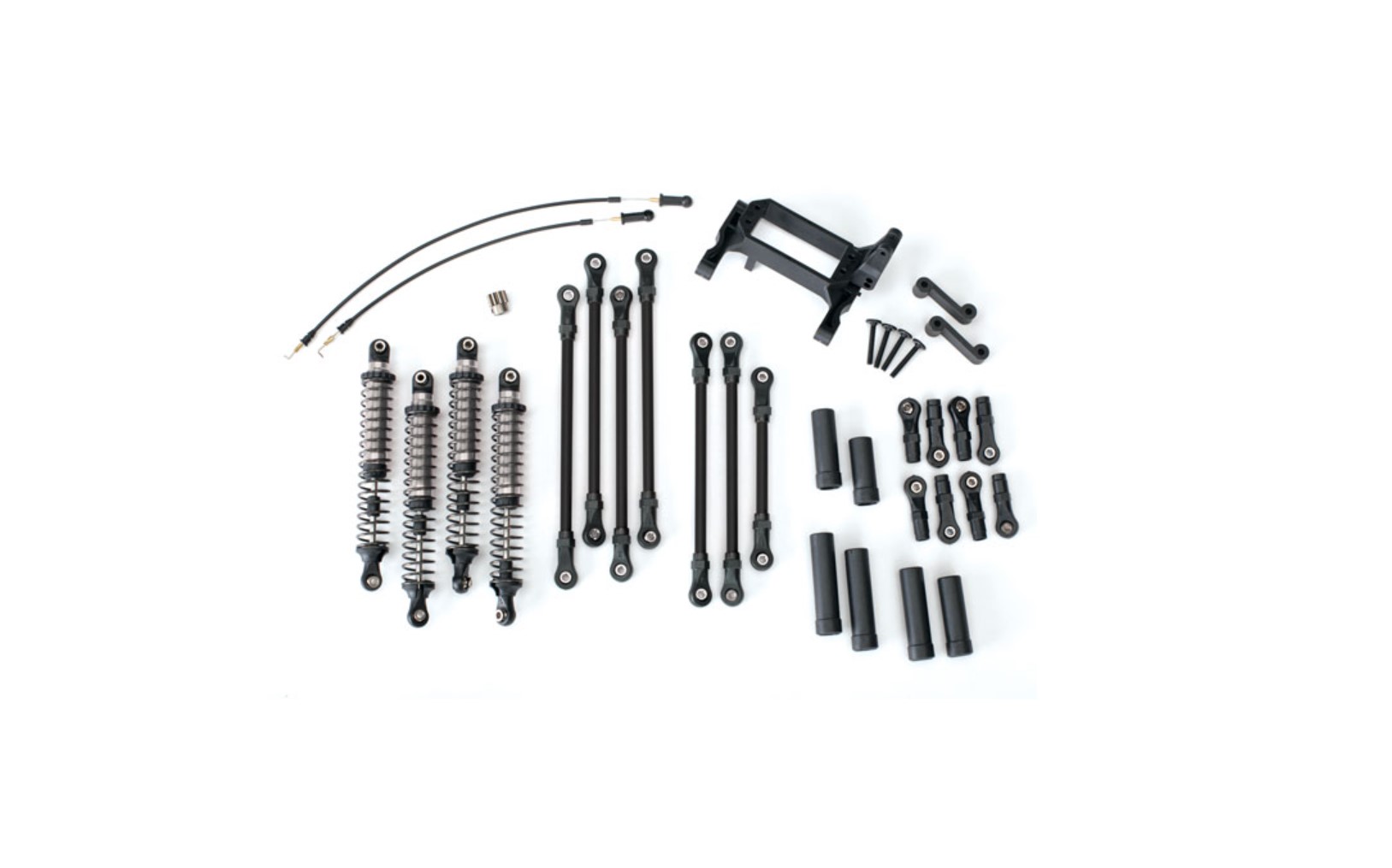 ロングアームリフトキットは、TRX-4の車高を2.2インチの大型ホイールとタイヤに合わせて引き上げ、路面状況に応じた最低地上高を実現します。キットには、GTSアルミショックアブソーバー、スプリング、ドライブシャフト、サスペンションリンク、Tロックケーブルが含まれています。改良されたマウントによりサーボの位置を低くすることで、適切なサスペンションとステアリングジオメトリを維持します。