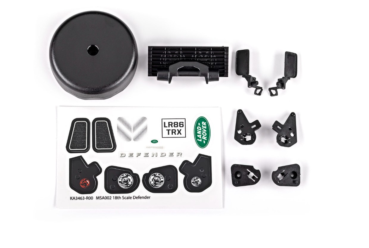 TRX-4M™ Land Rover Defenderボディ用アクセサリーには、グリル、サイドミラー、スペアタイヤカバー、ライトリテーナー、デカールが含まれます。(9712シリーズDefenderボディに適合)